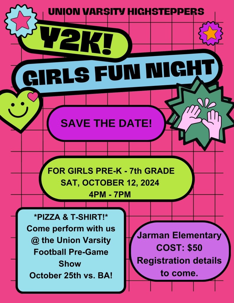 Girls in Pre-K – 7th Grade are invited to spend the evening with the Union Varsity Highsteppers at Jarman Elementary School (9015 E 79th St)! Receive a souvenir photo & t-shirt. Learn a fun dance routine, play games, & eat pizza.